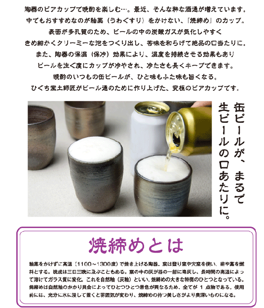 中でもおすすめなのが釉薬(うわぐすり)をかけない「焼締め」のビアカップ。